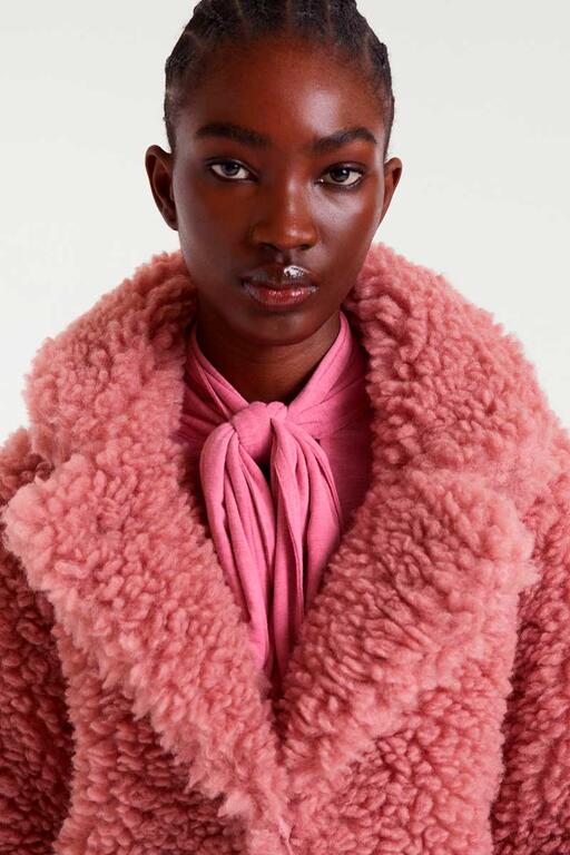 Abrigo de tejido faux fur de color rosado. Con cuello solapa y manga larga. Cierre frontal con botones. La modelo mide 178 cm y lleva la talla S.