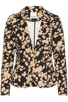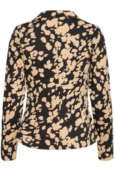 Blazer entallada con print a motas en color camel sobre fondo negro.