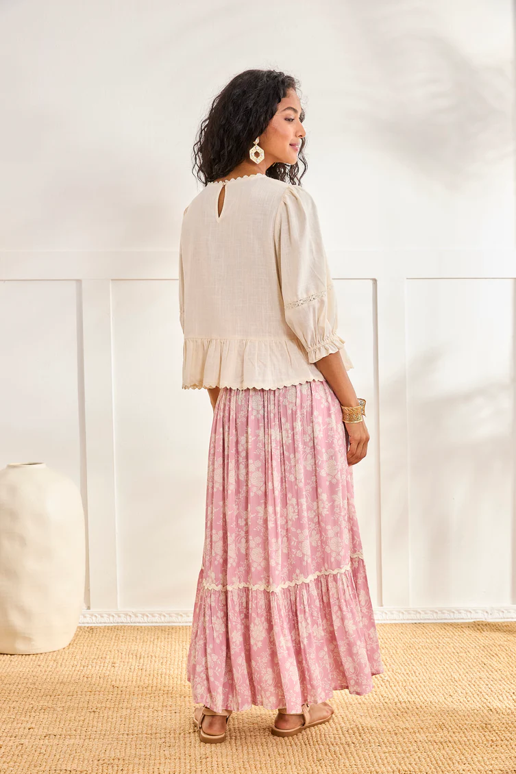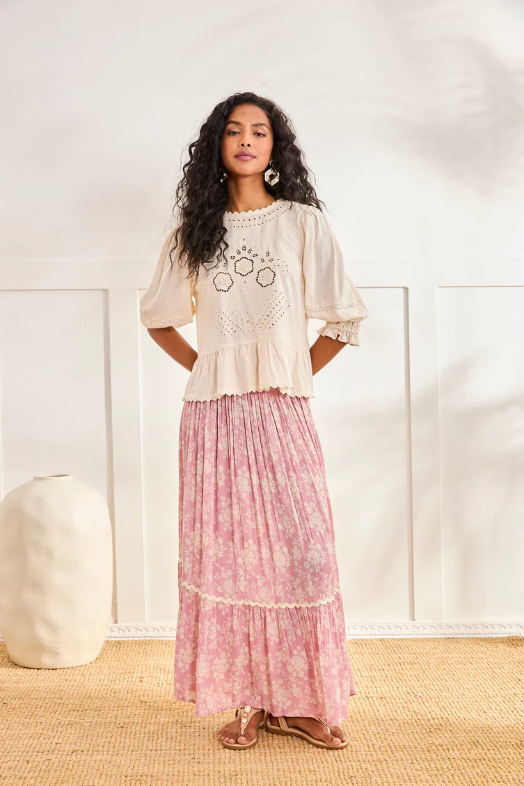 Blusa camisera de manga 3/4. Escote de cuello redondo. Detalle de bordados y calados frontal. Mangas abullonadas con puño elástico. Cierre trasero con botón.
