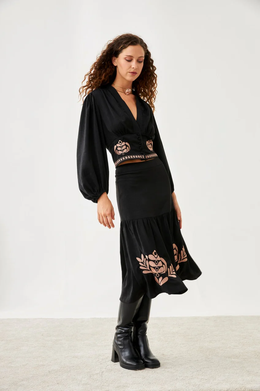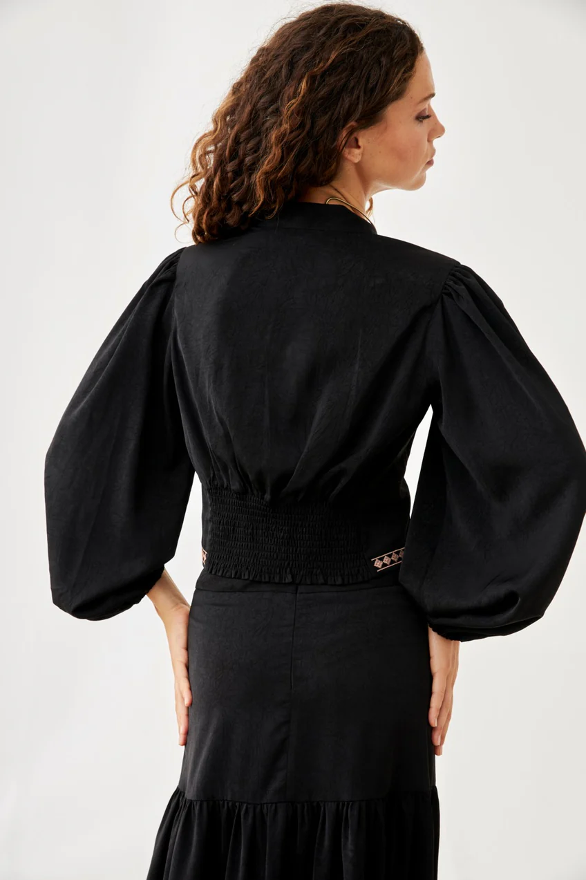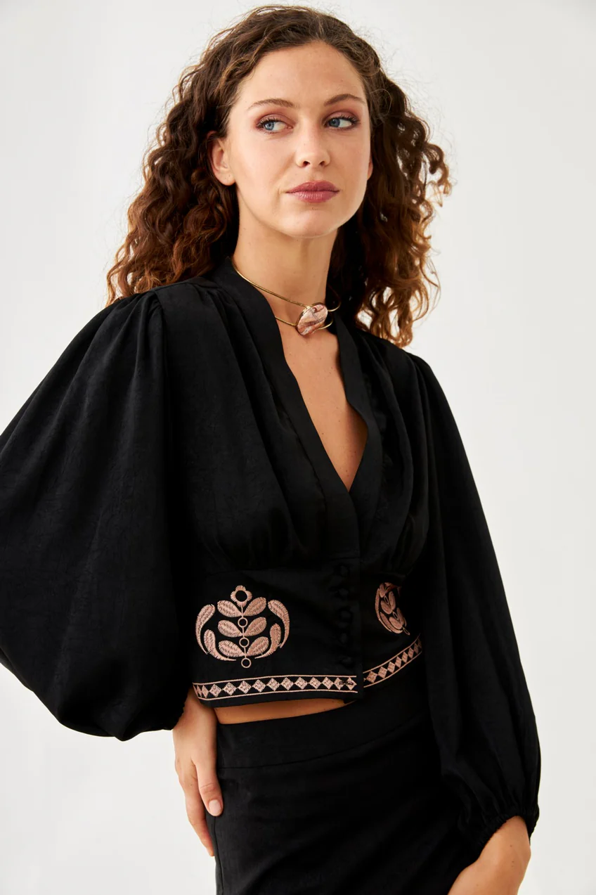 Blusa de mangas largas abullonadas con escote V. Cintura entallada con bordados.