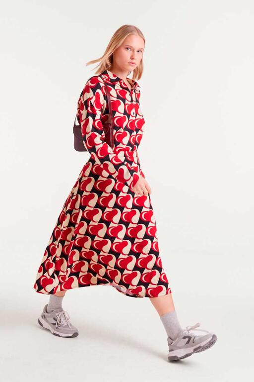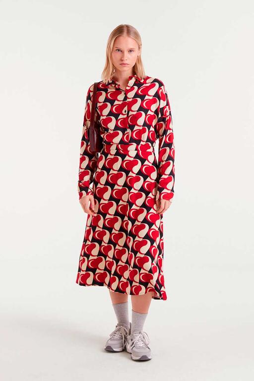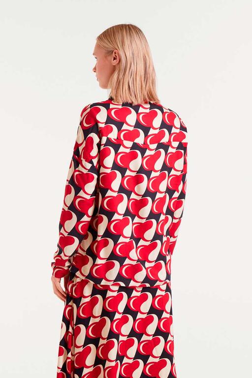 Camisa con tejido viscosa twill con estampado Heart Attack. Cuello con solapa y manga larga.Cierre frontal con botones. Hombro ligeramente caído. La modelo mide 174 cm y lleva la talla S.