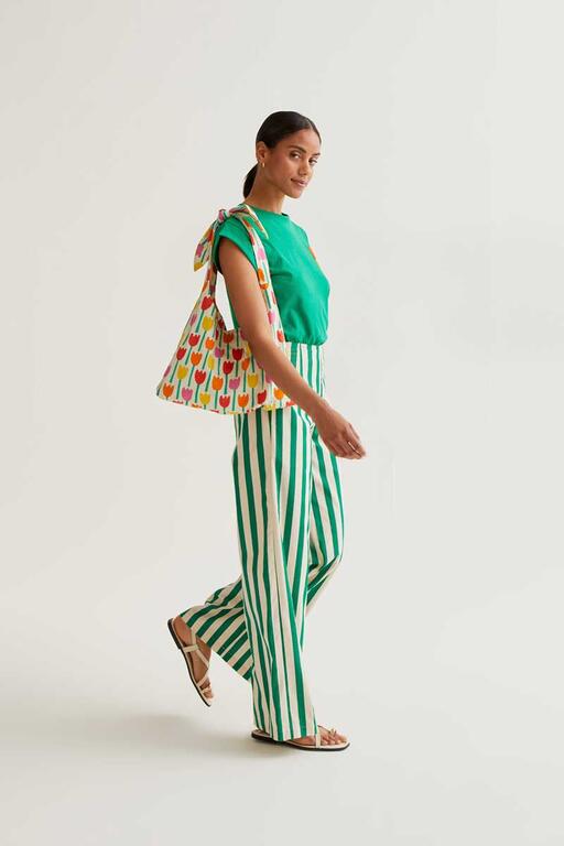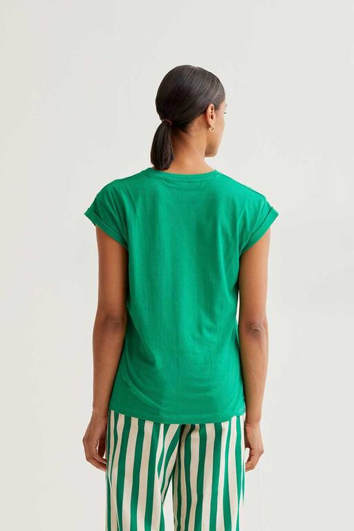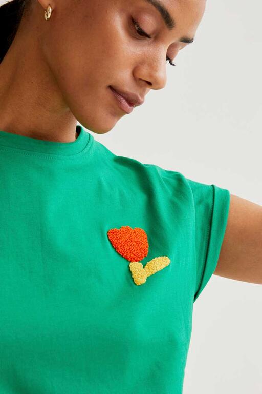 Camiseta con tejido 100% algodón de color verde. Cuello redondo y manga corta. Hombro ligeramente caído. Detalle de tulipán bordado en color rojo. La modelo mide 173 cm y lleva la talla S.