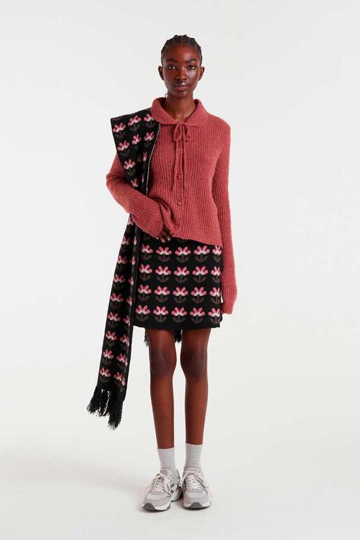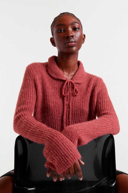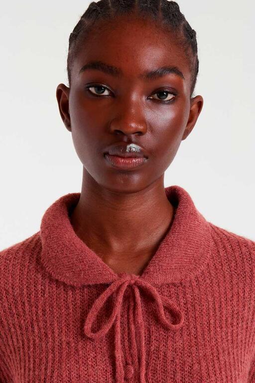 Cárdigan de punto de color óxido. Cuello redondo con corte babero y detalle en lazada. Con manga larga y cierre frontal con botones. La modelo mide 174 cm y lleva la talla S.