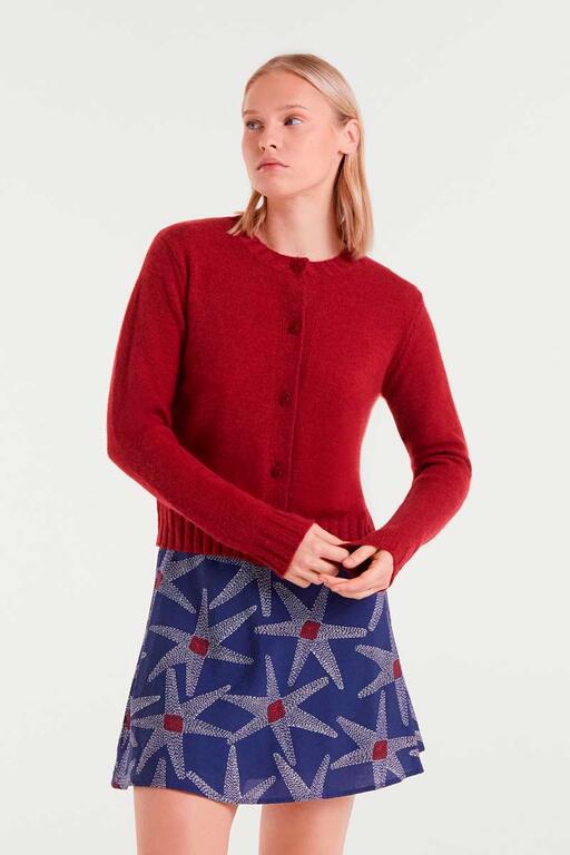 Cárdigan de punto color rojo. Con cuello redondo y manga larga. Hombro ligeramente caído. Cierre frontal con botones en forma de rosa. La modelo mide 174 cm y lleva la talla S.