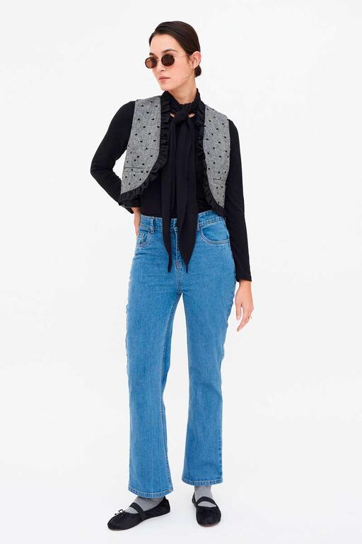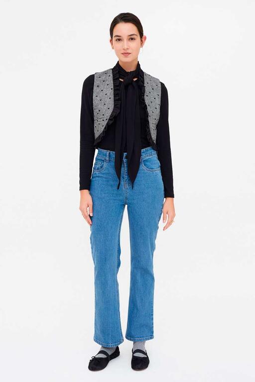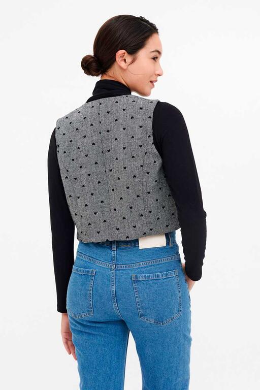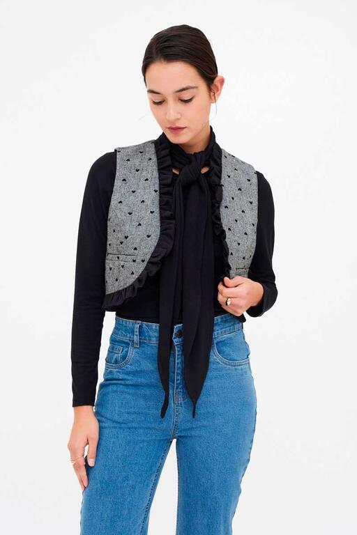 Chaleco de tejido tweed con estampado de corazones de color negro. Diseño abierto con volantes. Forro interior. La modelo mide 177 cm y lleva la talla S.