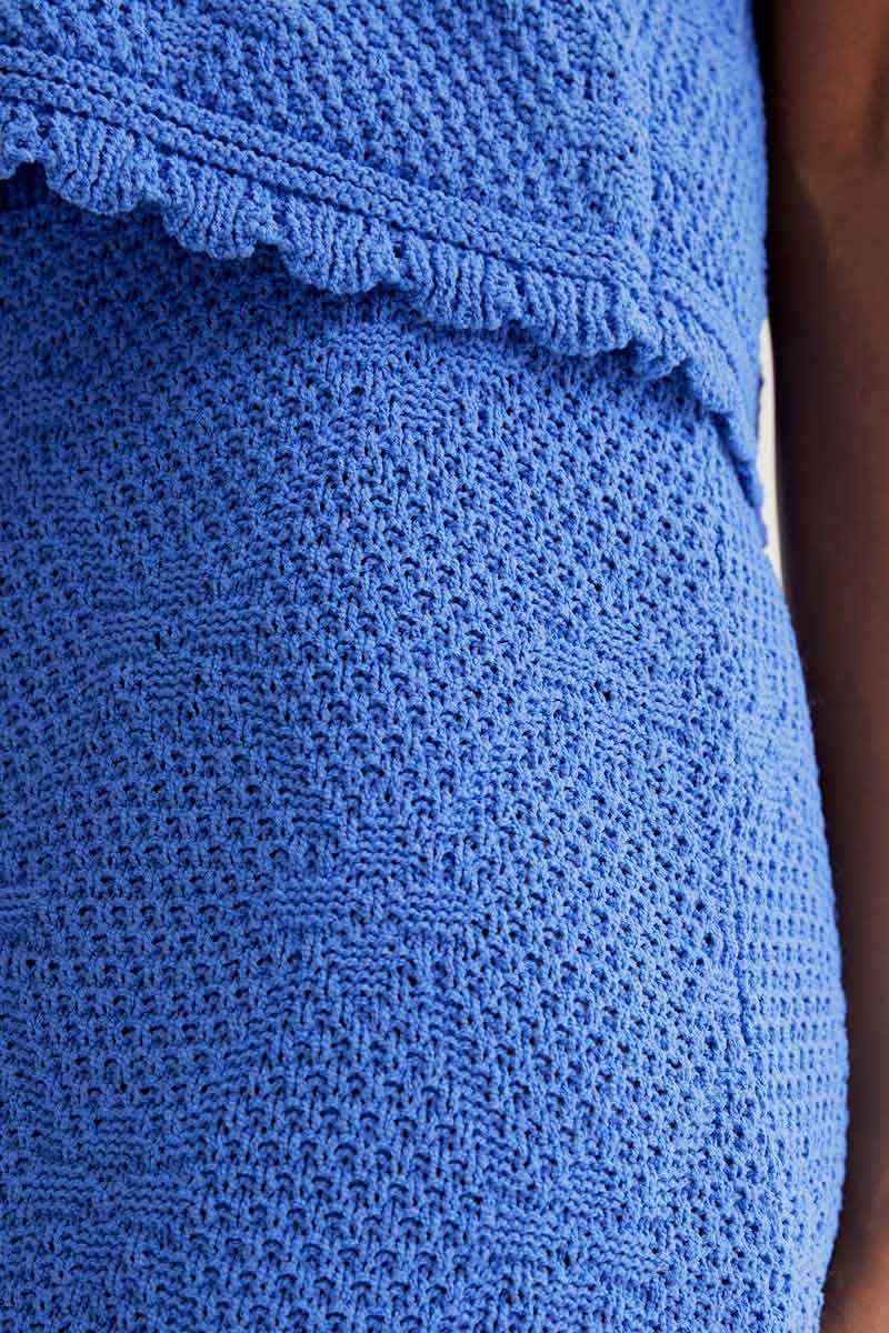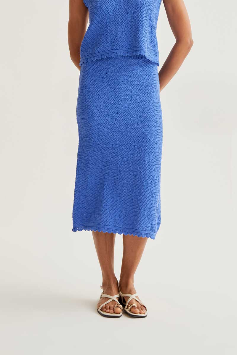 Falda con tejido de punto bordado encadenado de color azul. Goma en cintura. Detalles en relieves bordados. La modelo mide 177 cm y lleva la talla S.