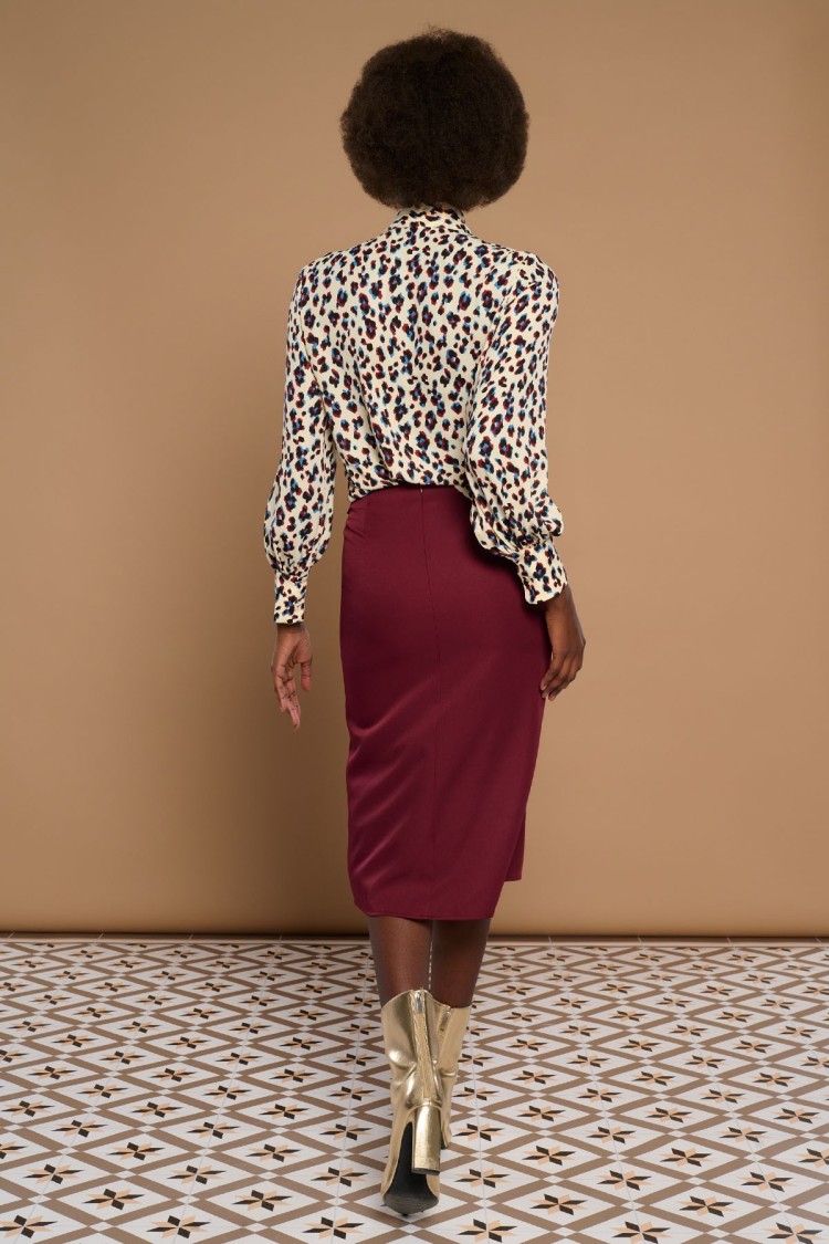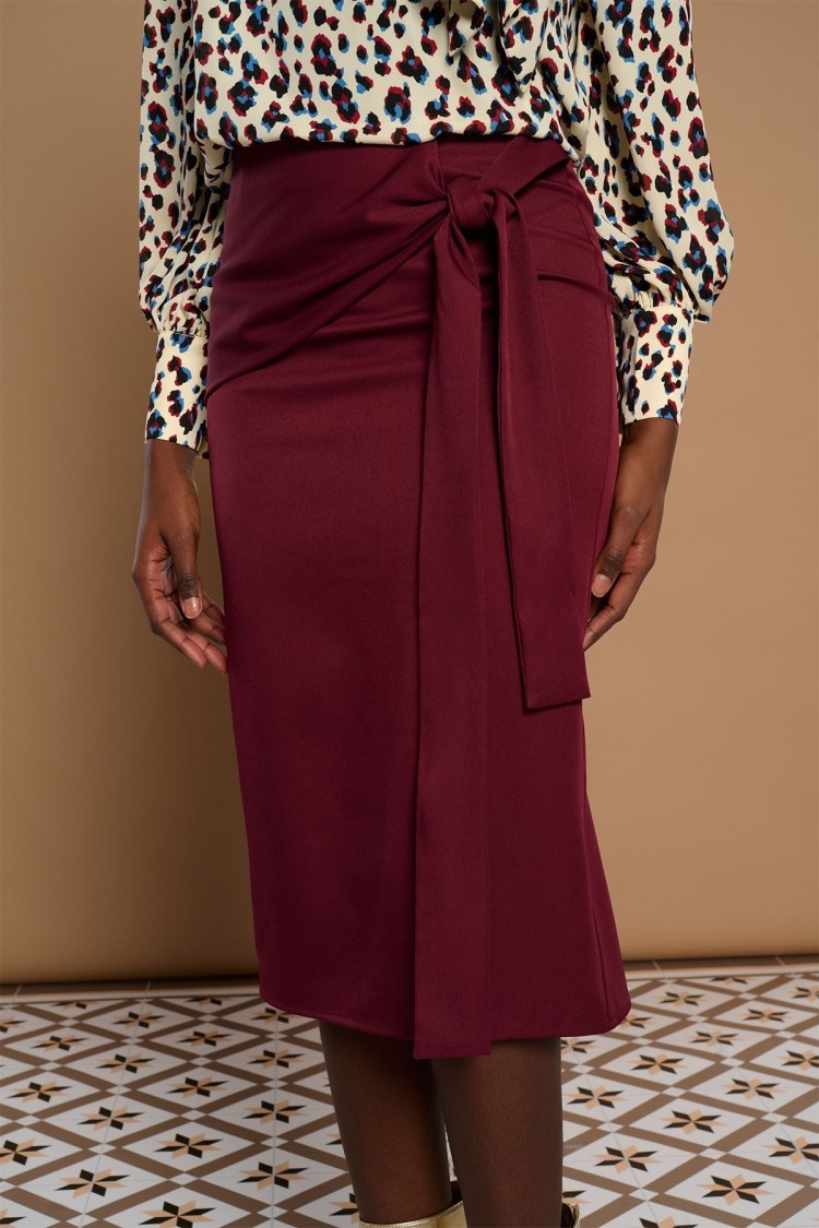 Falda midi con lazo en lateral. Color burdeos. Forro interior. Cierre con cremallera trasera oculta en costura.
