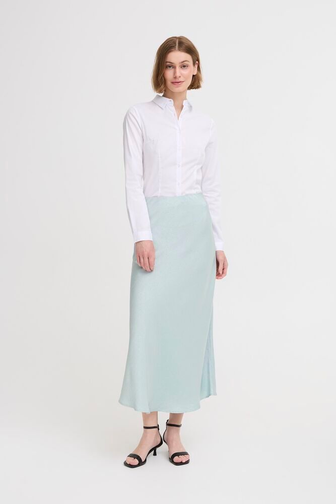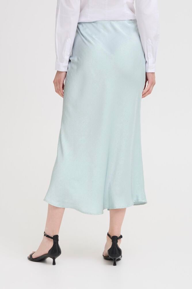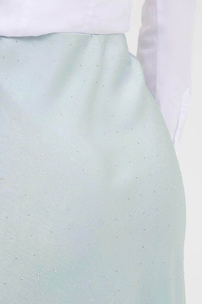 Falda satinada en color azul celeste con incrutaciones de pedreria plateadas.