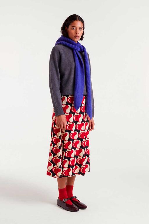 Falda midi de tejido viscosa twill con estampado Heart Attack. Cintura fija de tiro alto con cremallera invisible lateral. La modelo mide 178 cm y lleva la talla S.