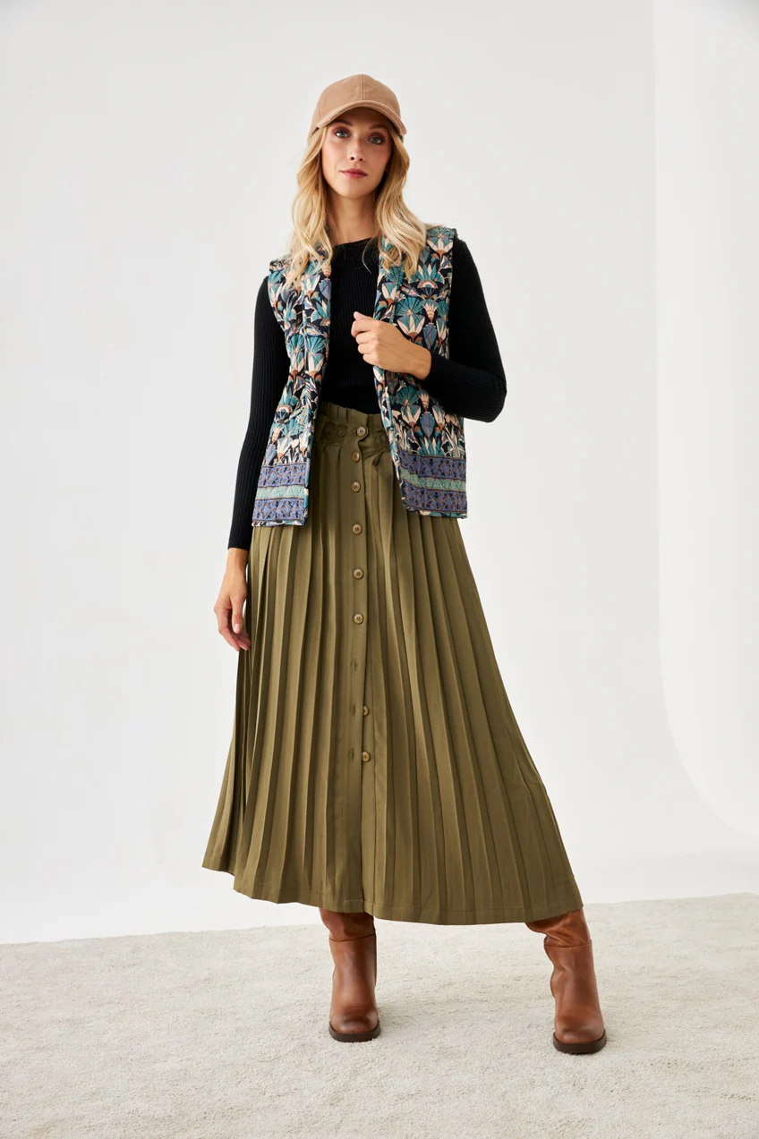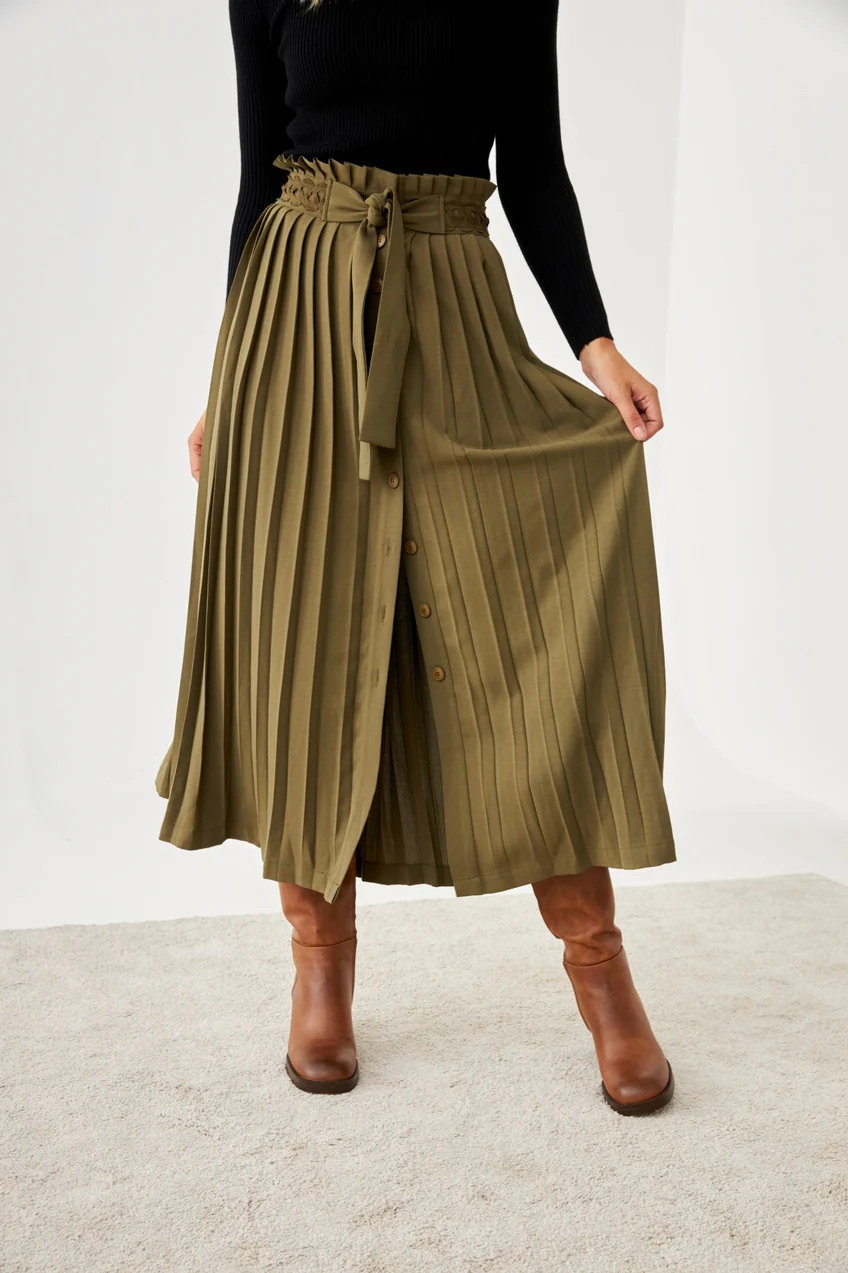 Falda larga plisada con botonadura completa frontal. Lazada para anudar en la cintura.