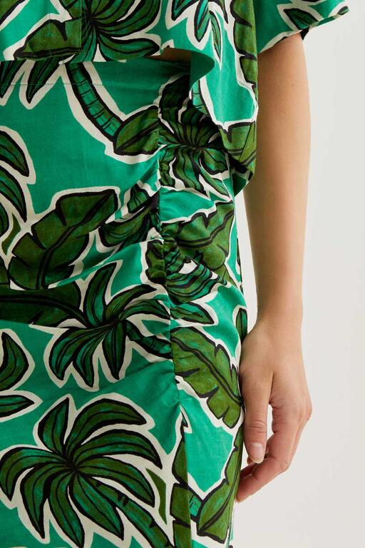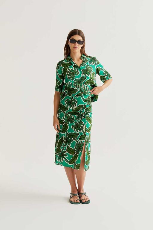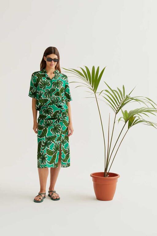 Falda midi con estampado palm tree. Cintura elástica de tiro alto.Ligera abertura frontal. La modelo mide 177 cm y lleva la talla S