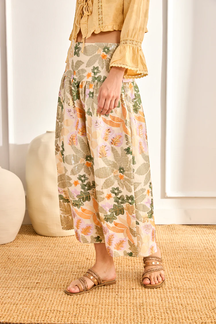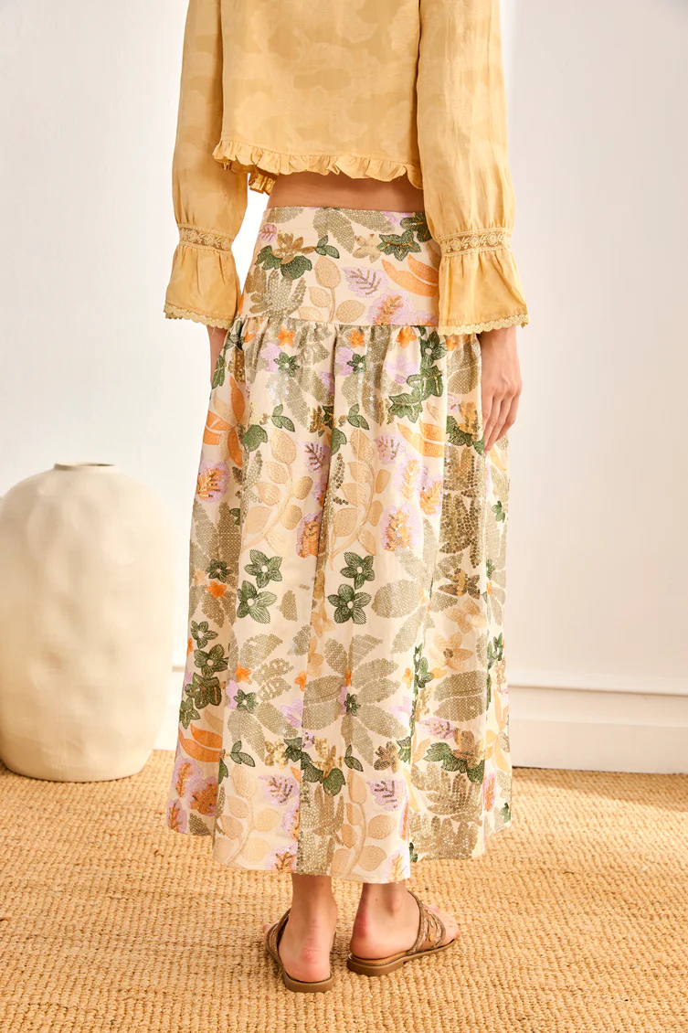 Falda larga con pinzas a partir de la cadera. Detalle de motivos florales multicolor bordados y con diseño de lentejuelas. Cierre de cremallera invisible en un lateral.
