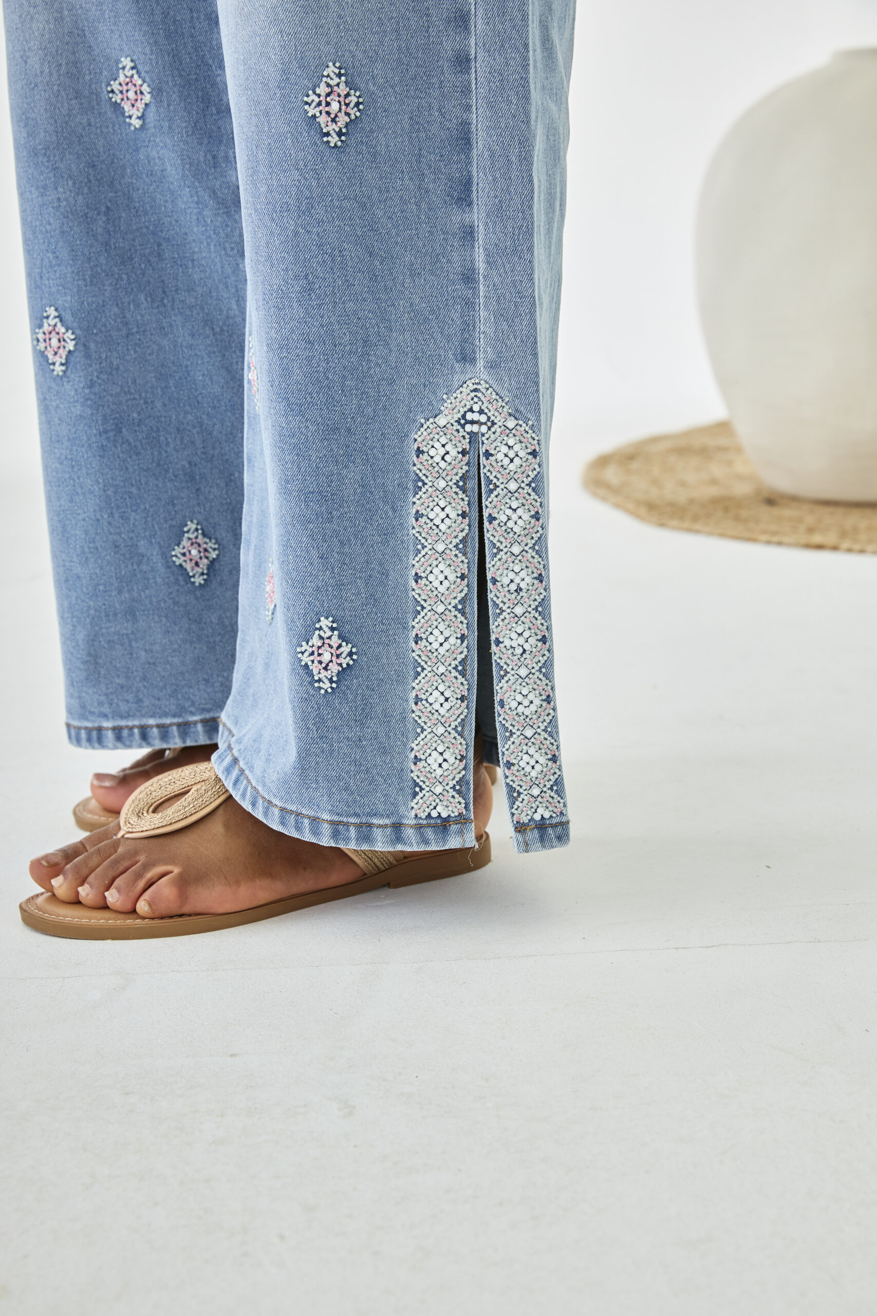 Pantalón denim en algodón con piedrecitas.