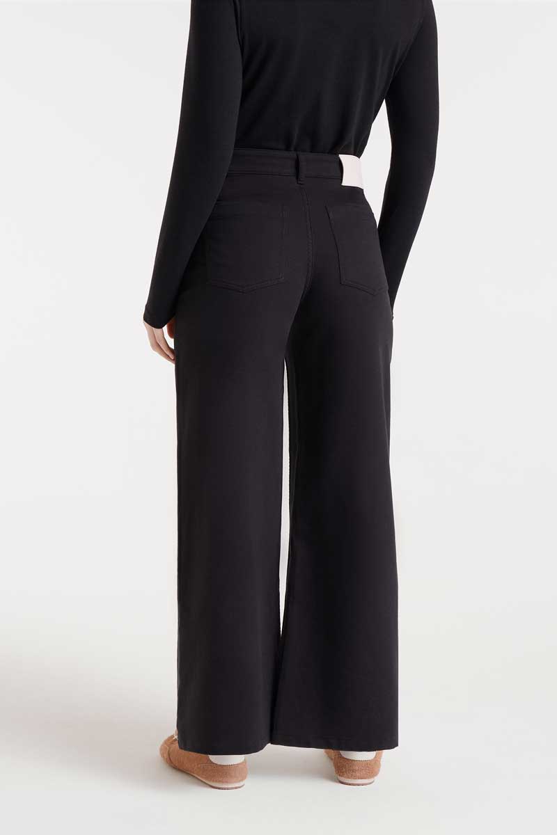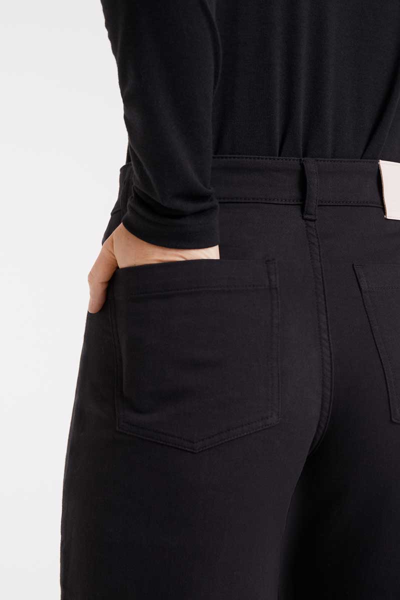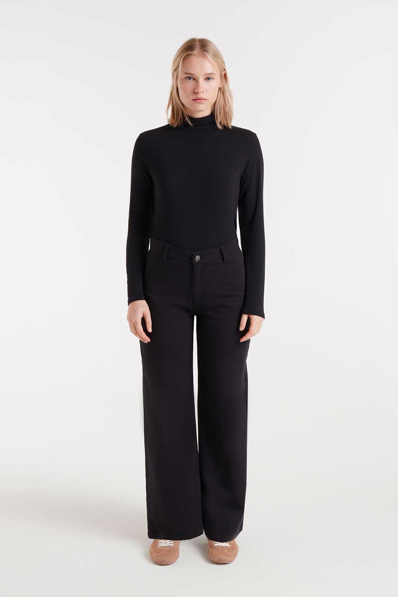 Pantalón vaquero de color negro con tejido de denim elástico. Tiro alto y pernera recta. Cierre frontal con cremallera y botón. Bolsillos laterales y traseros. La modelo mide 174 cm y lleva la talla S.