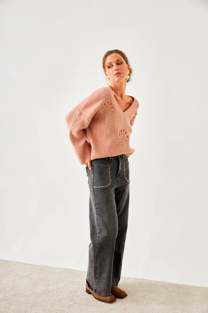 Jersey en punto de canalé, cuello pico con flores al tono.