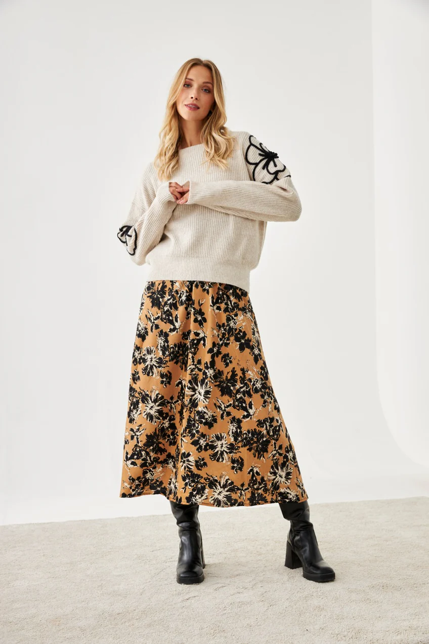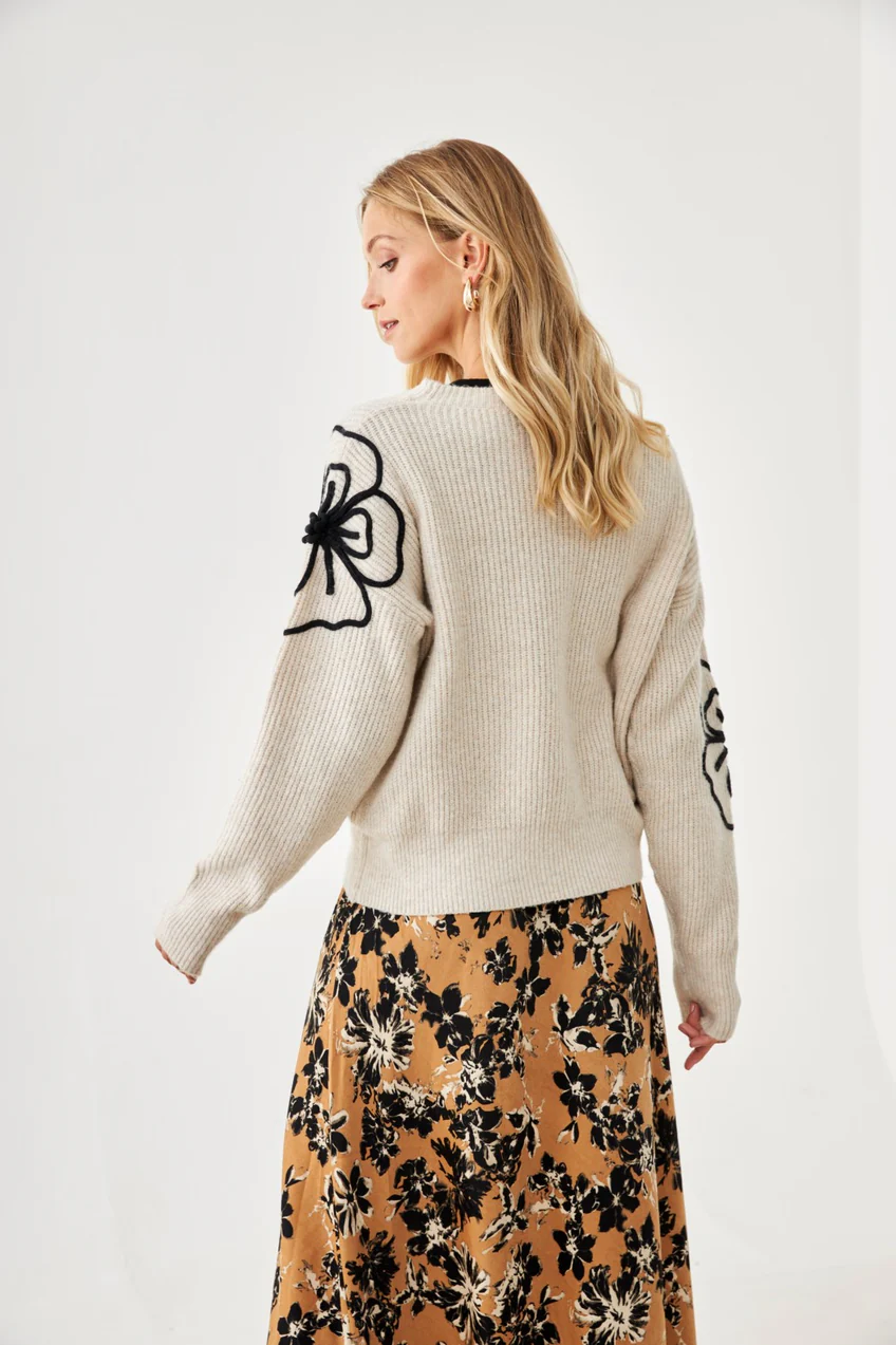 Jersey acanalado de cuello redondo con flores bordadas en contraste de color en las mangas.