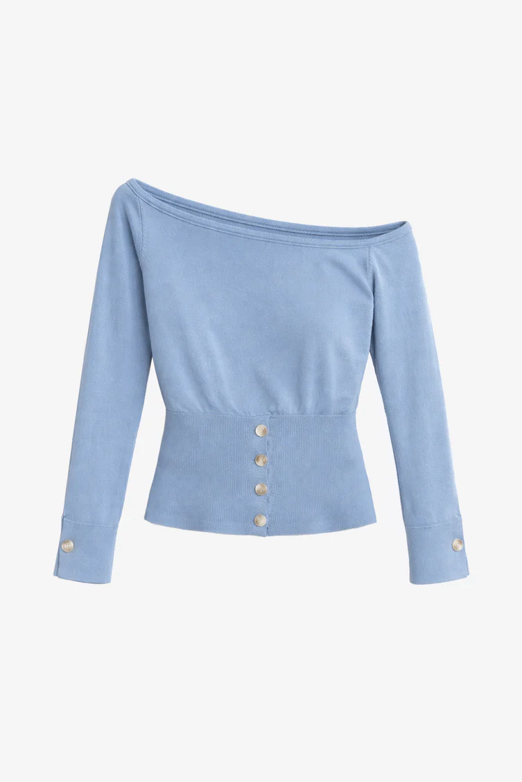 Jersey de punto fino con escote asimétrico. Cintura ceñida con botonadura. Puños con botones.