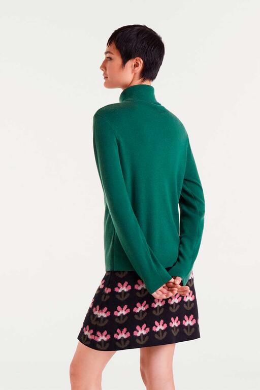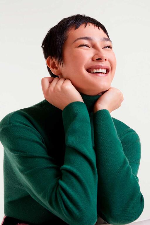 Top con tejido punto fino de color verde. Con cuello alto y manga larga. La modelo mide 175 cm y lleva la talla S.