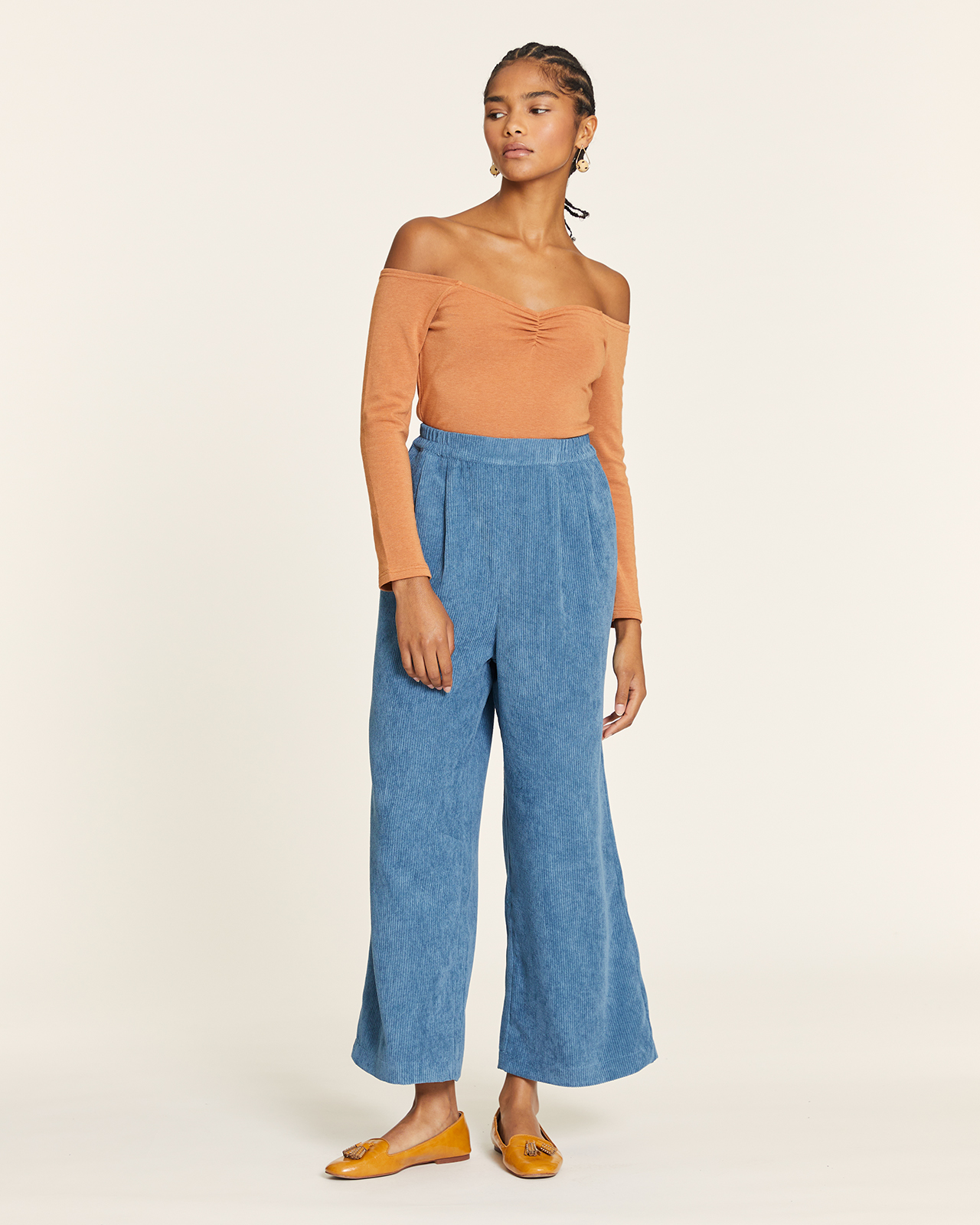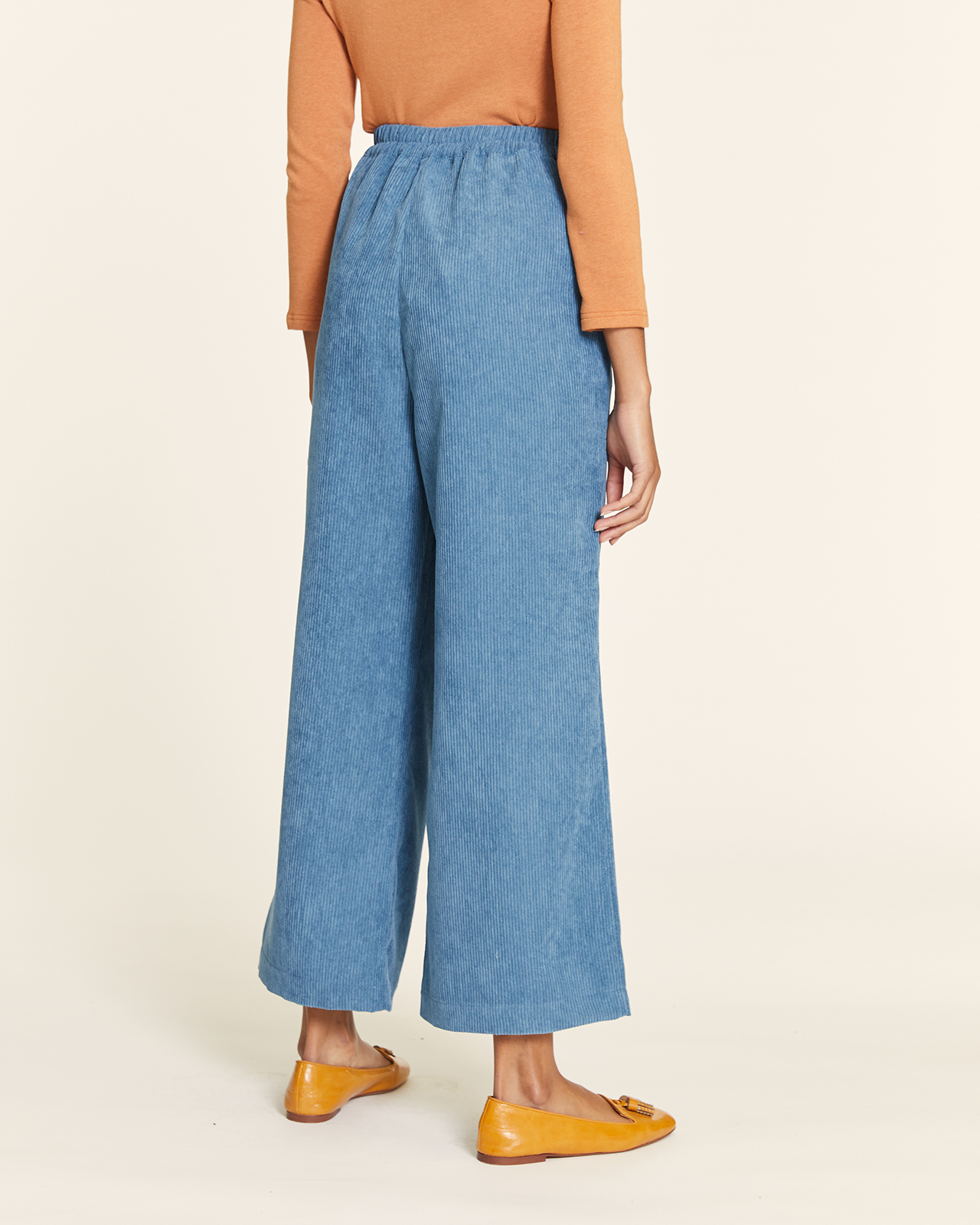 Pantalón culotte de tiro alto con doble pinza en el delantero, bolsillos inclinados y cinturilla elástica para mayor comodidad.