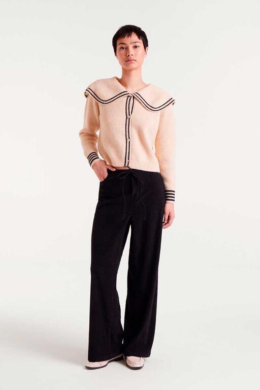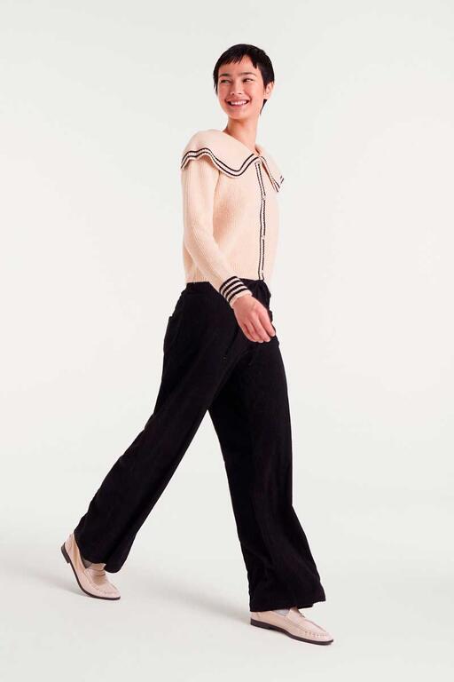 Pantalón con tejido de pana de color negro. Cintura fija de tiro medio con goma elástica trasera ajustable con cordón. Pernera recta. Bolsillos laterales. La modelo mide 177 cm y lleva la talla S.
