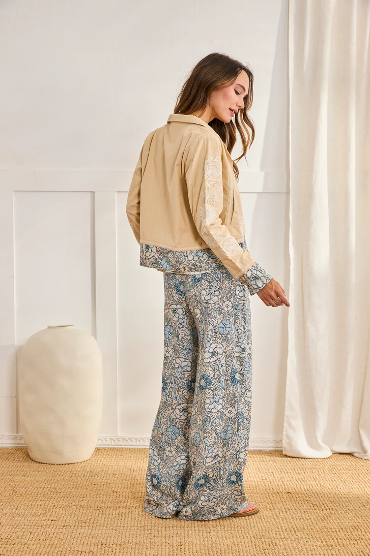Pantalón largo estilo palazzo en tejido fino estampado floral. Cintura fruncida con tira en el mismo tejido para anudar acabada con cuentas.