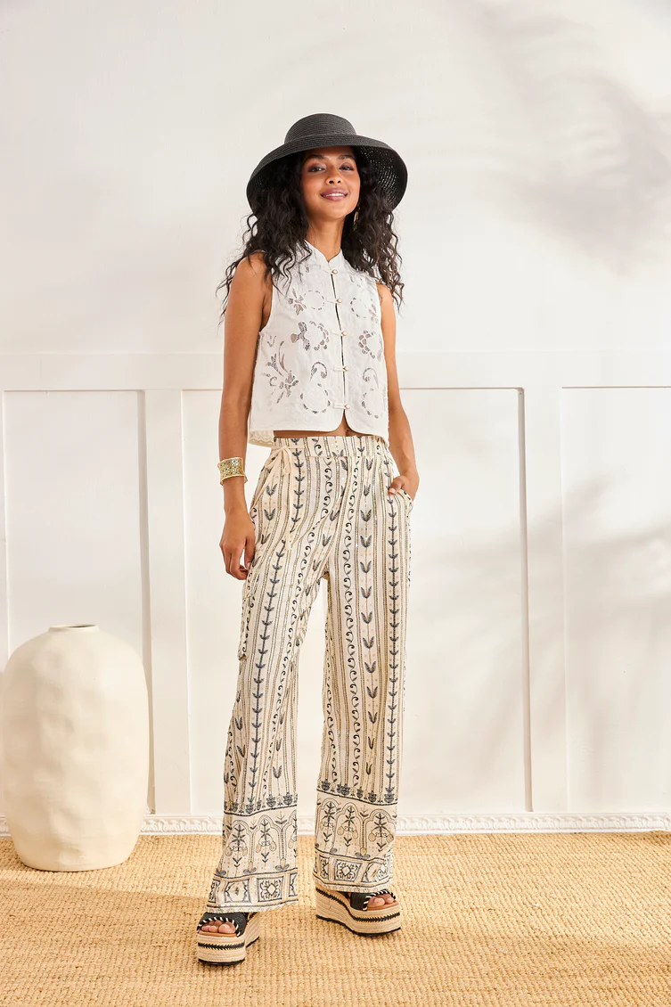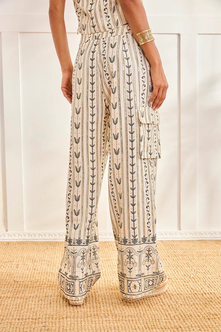 Pantalón recto bordado. Detalle de lentejuelas y bolsillo lateral. Cierre con cremallera y sobrecinturilla con cierre de lazada.