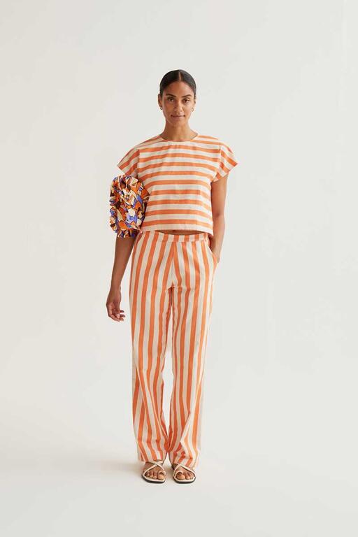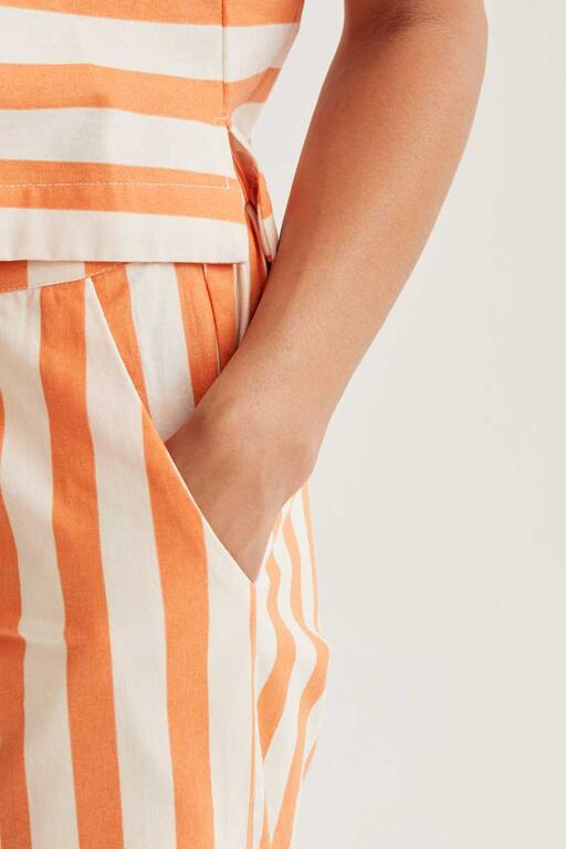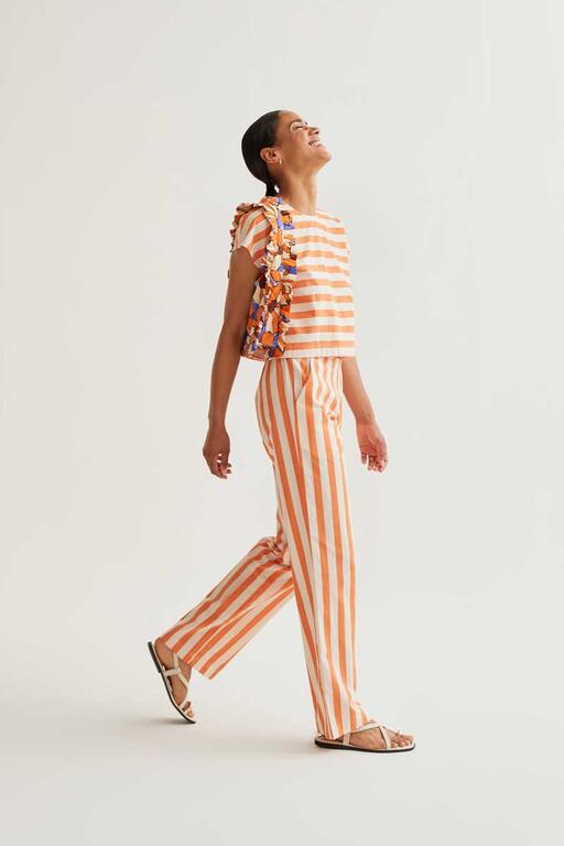 Pantalón de tejido 100% algodón con estampado bamboo orange. Cintura elástica de tiro alto. Pernera recta. Bolsillos laterales. La modelo mide 173 cm y lleva la talla S.