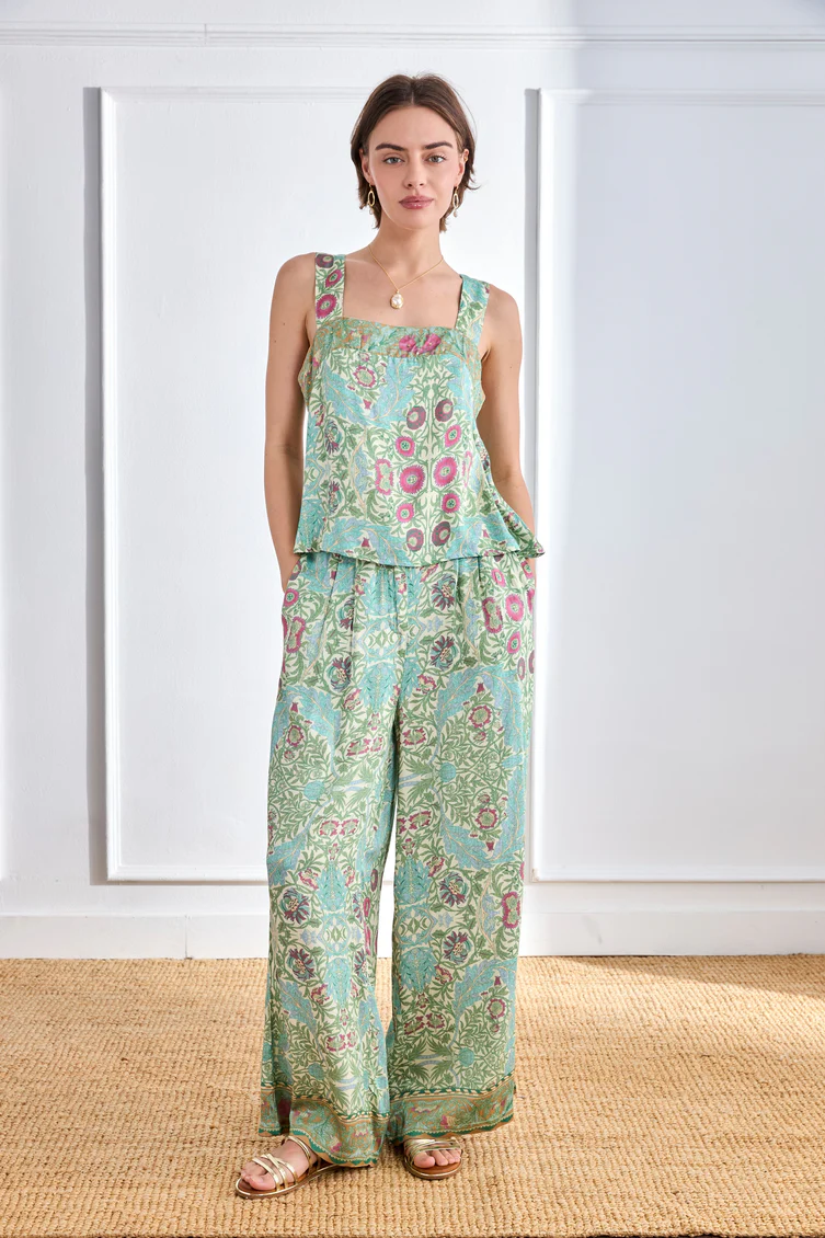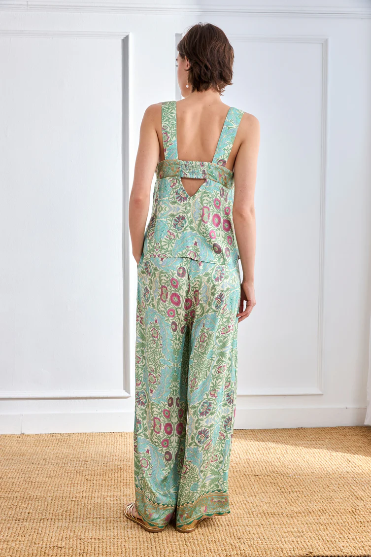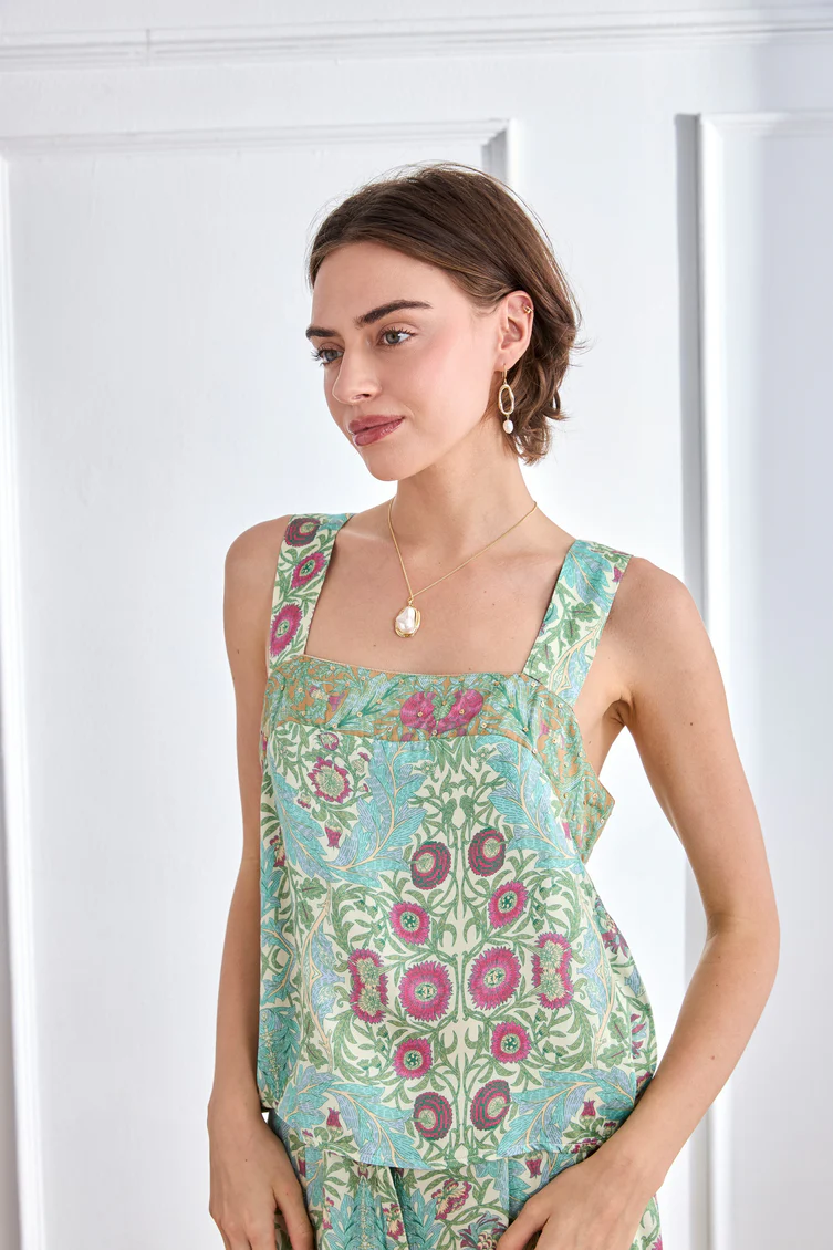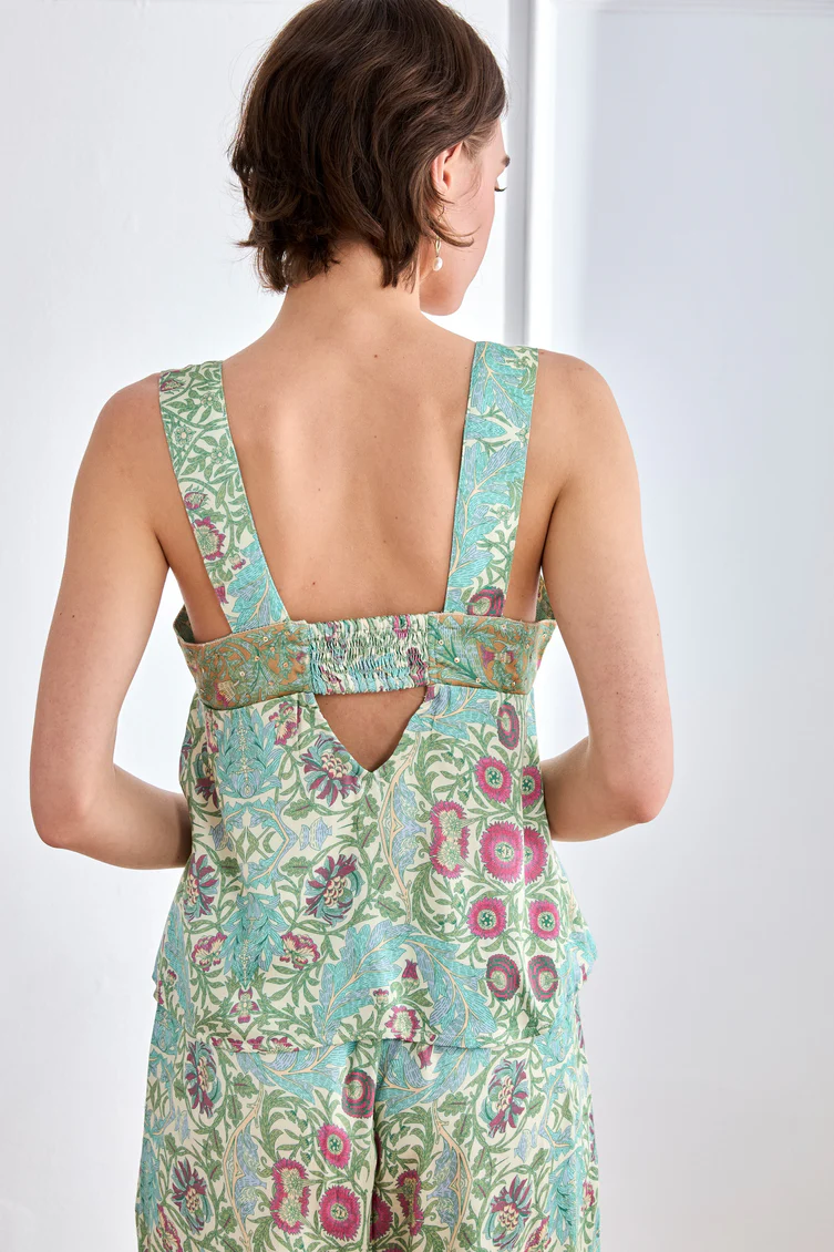 Top de tirantes anchos y escote cuadrado. Detalle de lentejuelas sobre cinta ribeteando el escote. Bajo con péplum. Cut out acabado en V en la espalda con fruncido central.