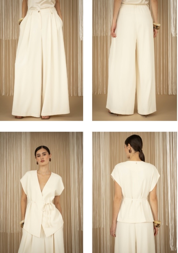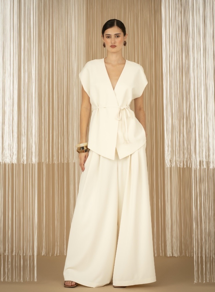 Set compuesto por chaleco y pantalón en tejido de crepé. Chaleco cruzado con cordón para anudar en cintura. Pantalón con pinzas, bolsillo y elástico en la parte posterior