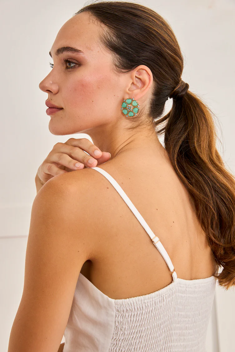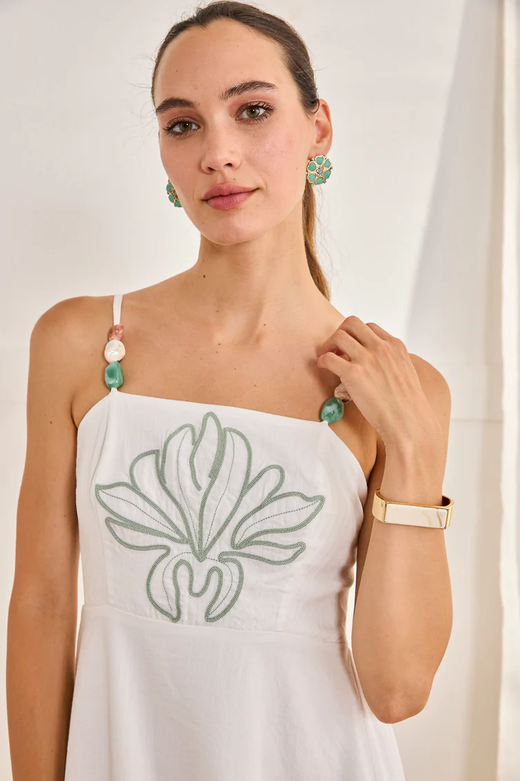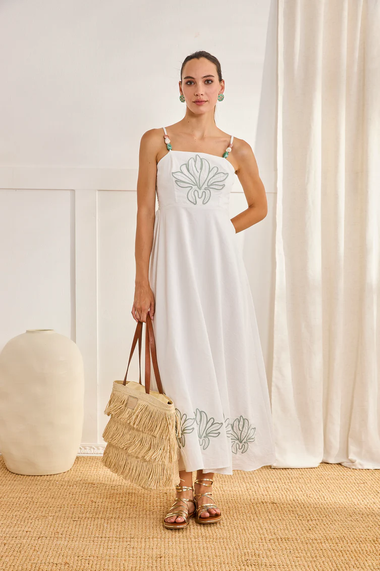 Vestido largo blanco de tirantes. Detalle bordado floral en escote y bajo. Detalle de piedras en tirantes regulables. Escote cuadrado. Espalda fruncida
