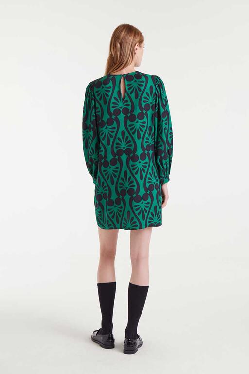 Vestido corto con estampado Baroque. Con cuello redondo y manga larga francesa. Cierre trasero con botón. La modelo mide 179 cm y lleva la talla S.