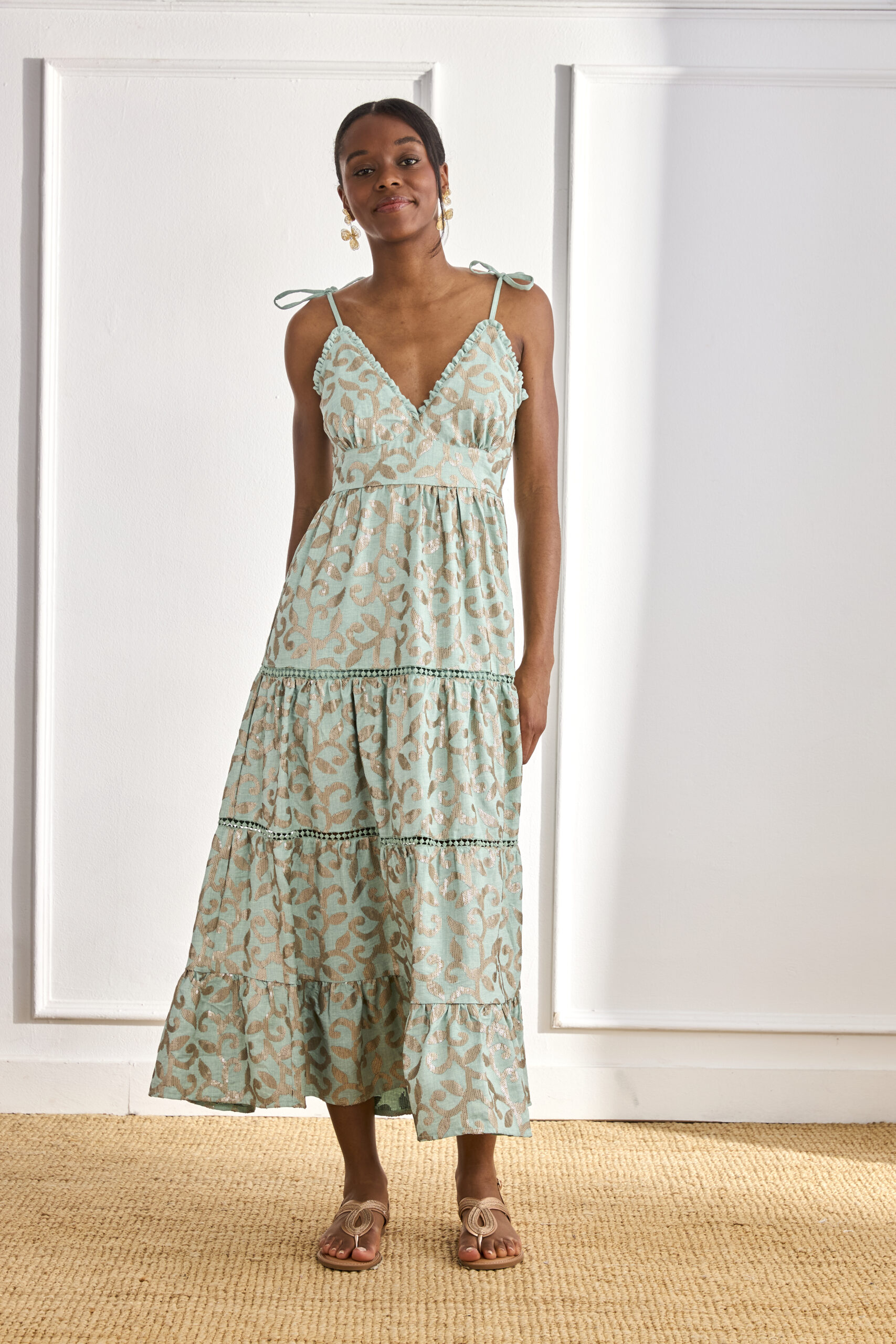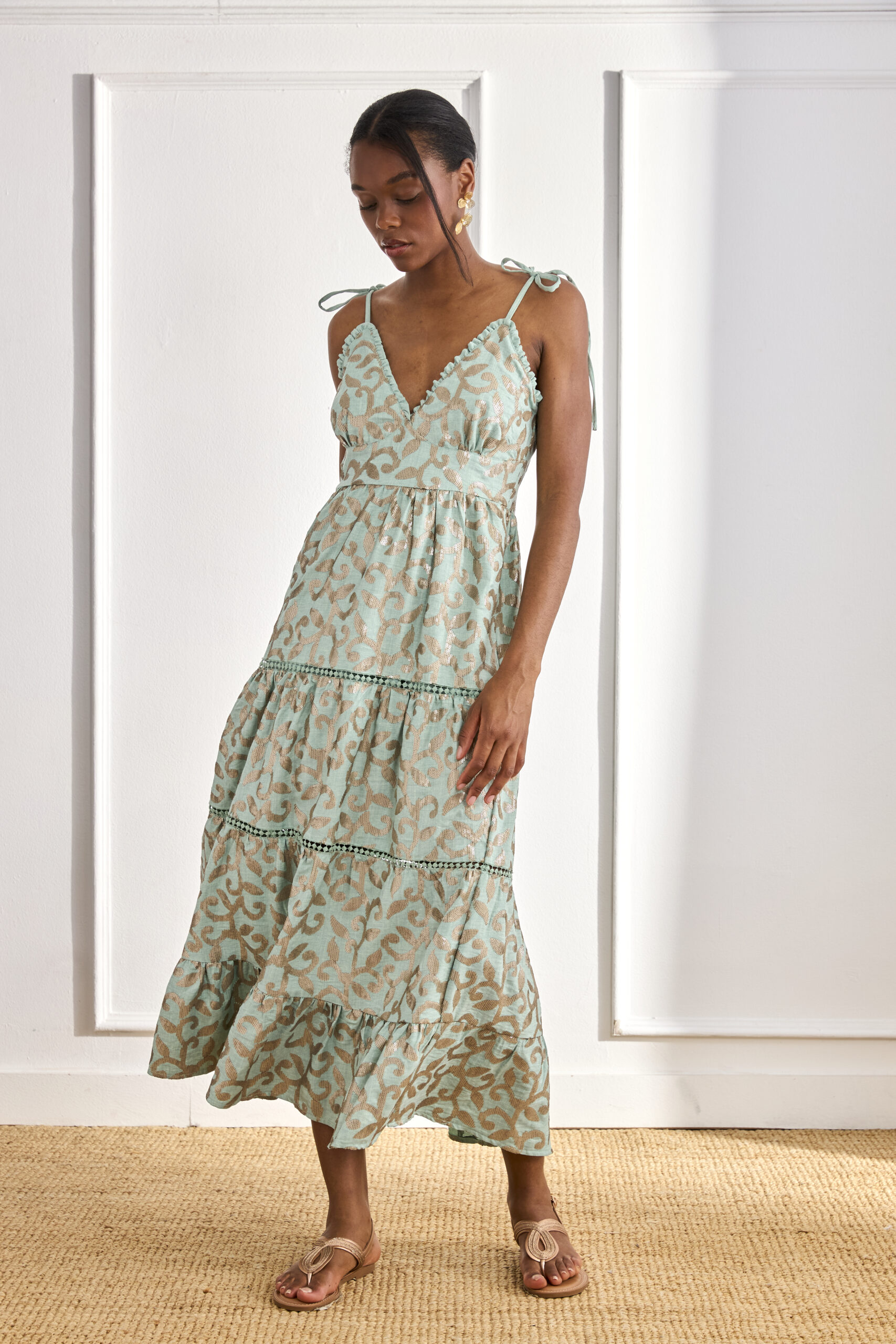 Vestido largo de tirantes finos anudados en los hombros. Escote V ribeteado con volante. Cintura ceñida. Detalle de lentejuelas bordadas formando motivos de hojas. Falda acampanada con volante en el bajo.