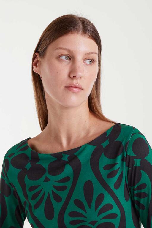Vestido largo de color verde con estampado Baroque. Con cuello barco y manga larga. La modelo de mide 177 cm y lleva la talla S.