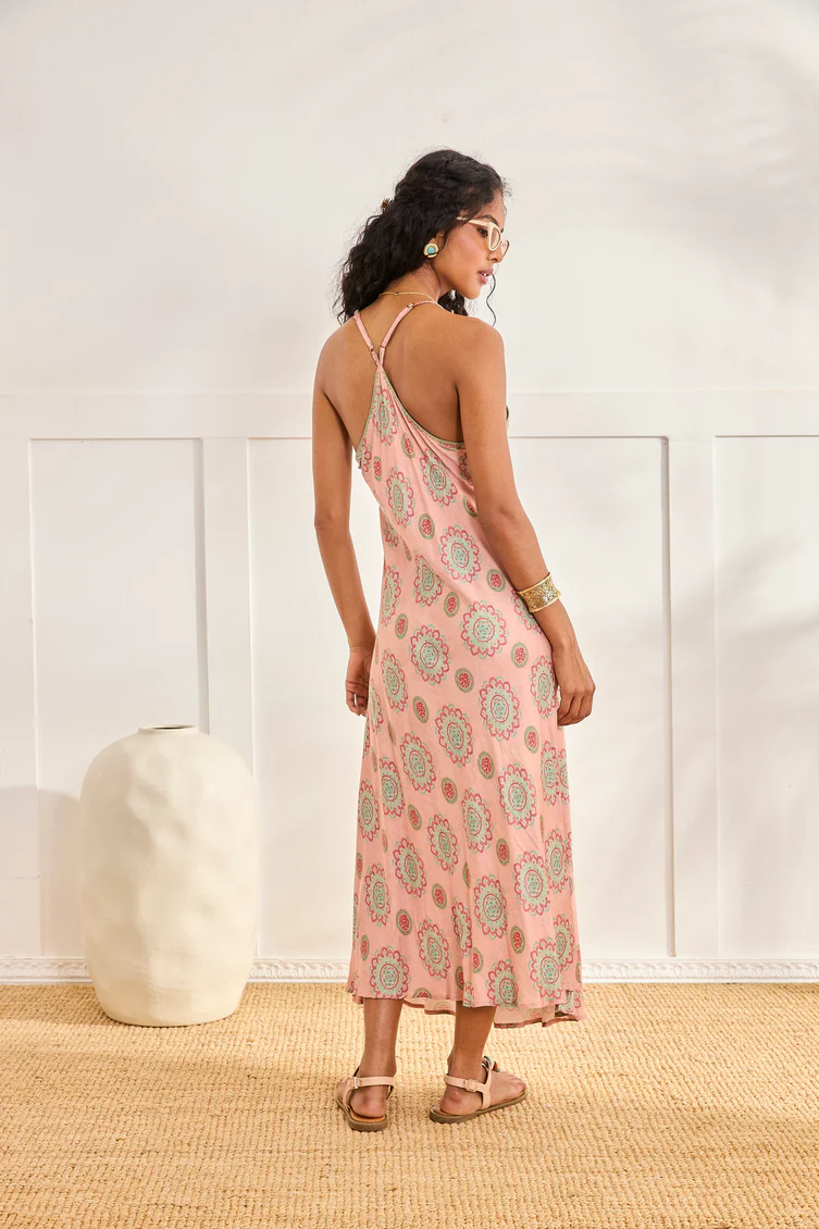 Vestido tejido fluido estampado de mandalas de tirantes finos regulables. Escote redondo con detalles bordados.